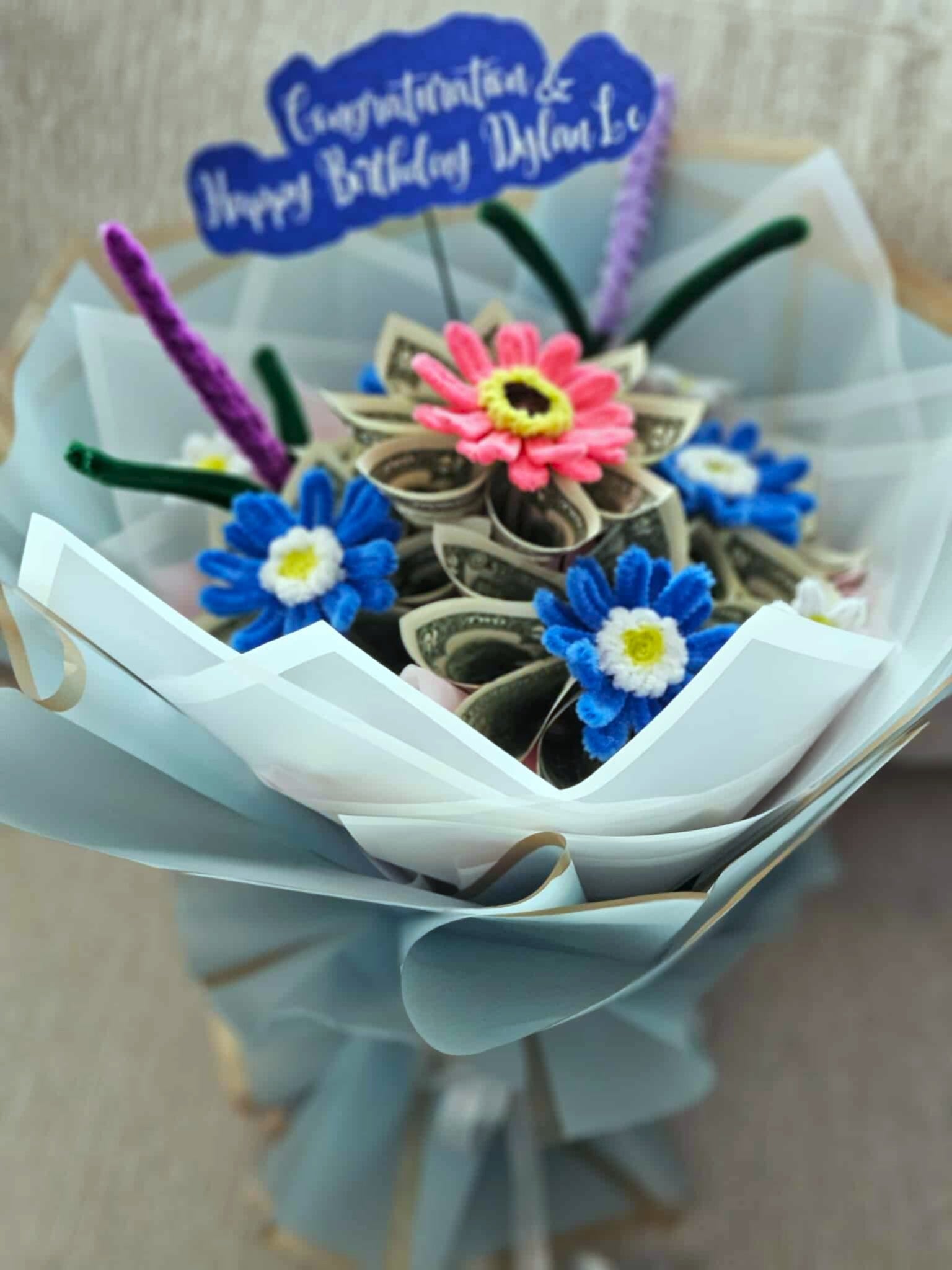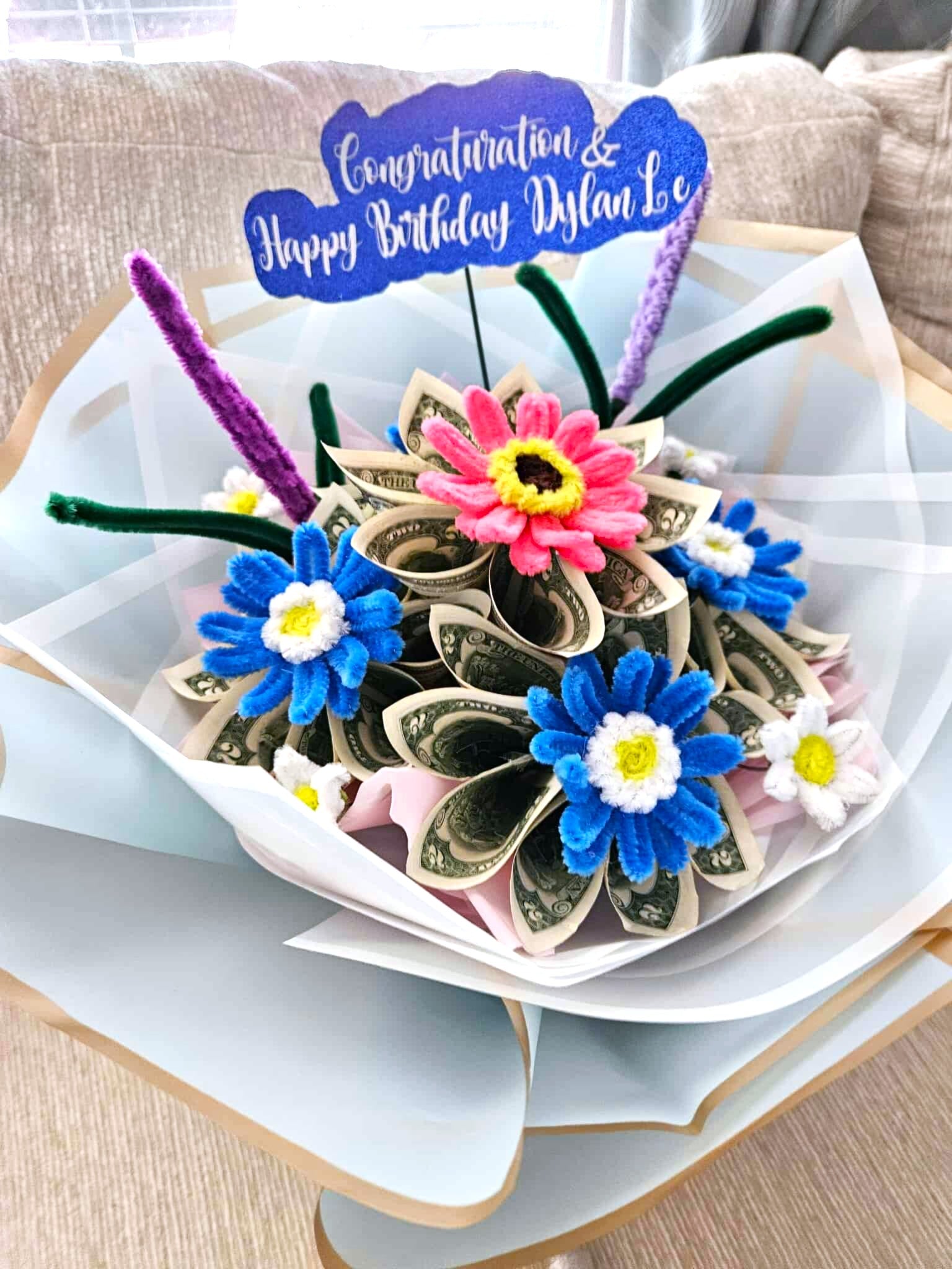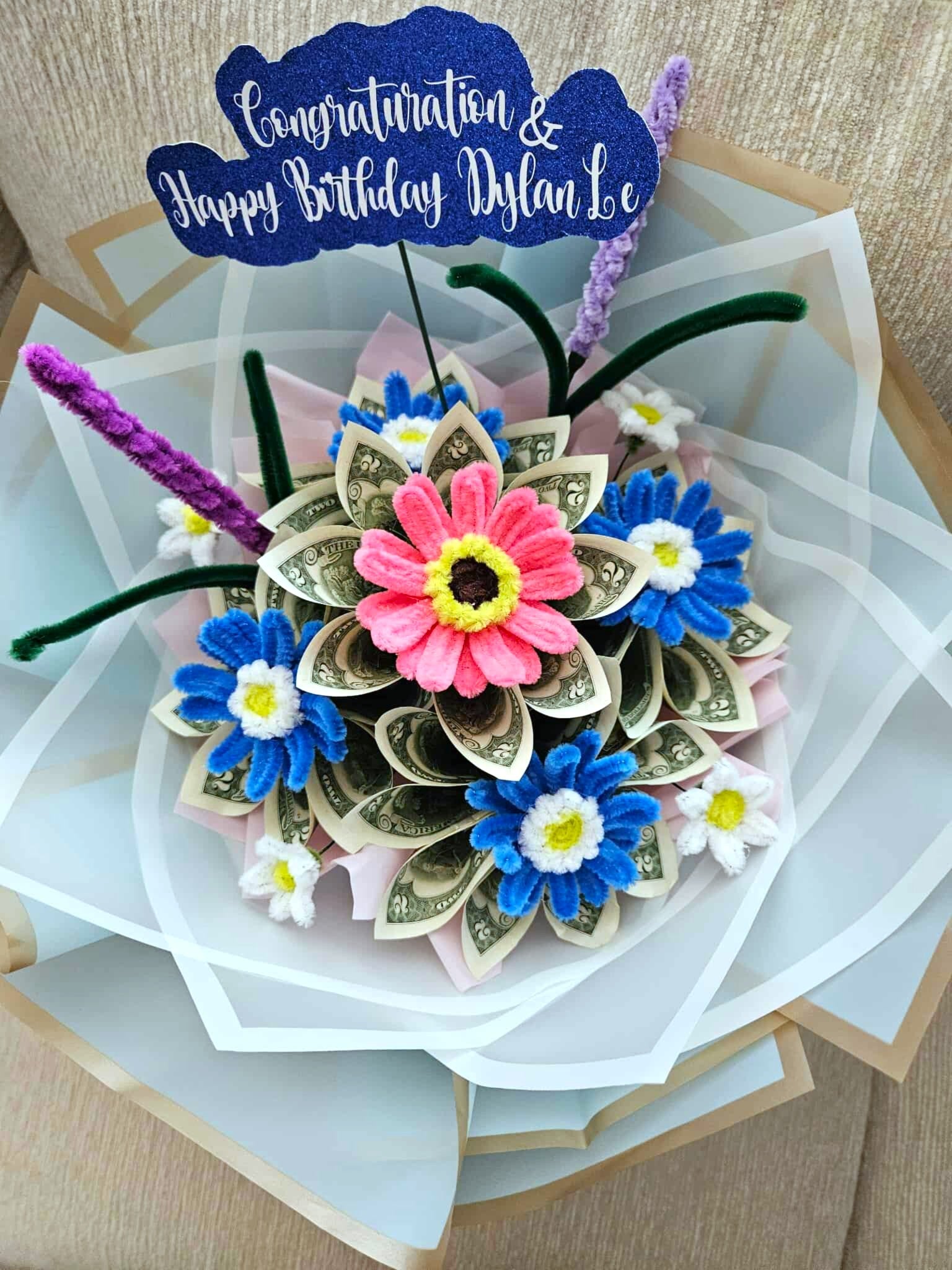 The bouquet is made from twenty $2 bills, combined with delicately handcrafted flowers from pipe cleaner. The bills denomination, flower and wrapping colors, and message on the bouquet can all be customized to your request.